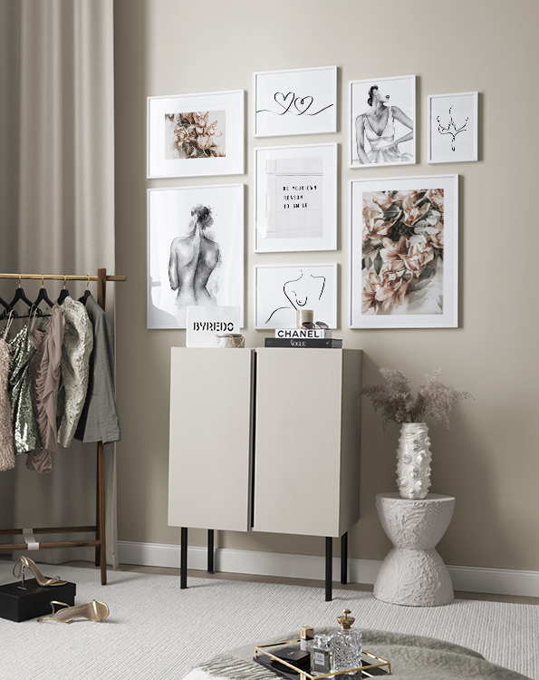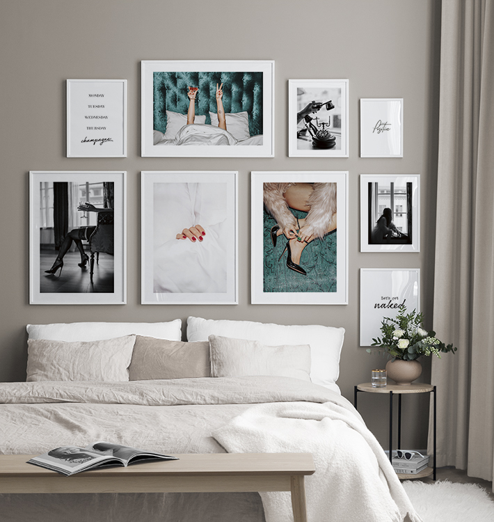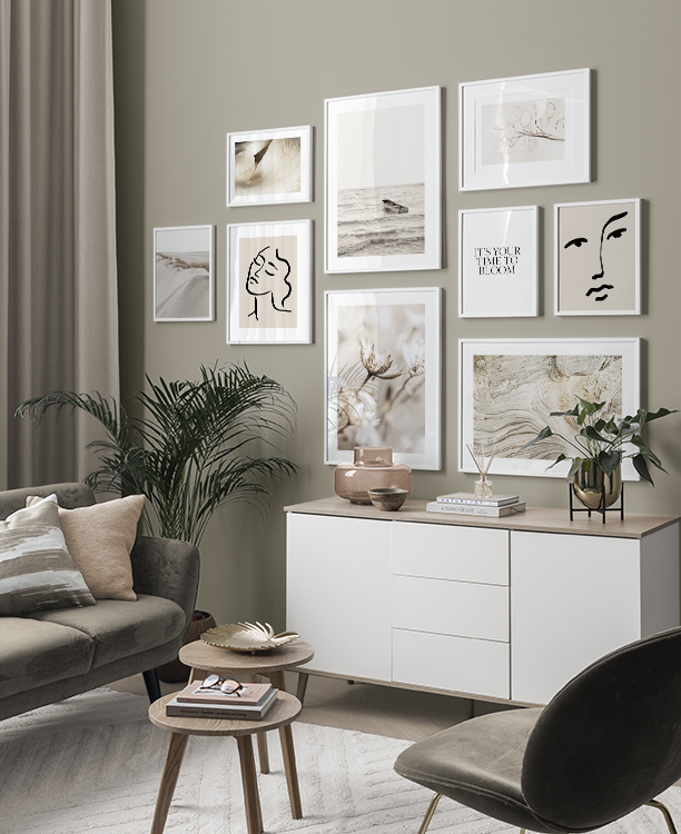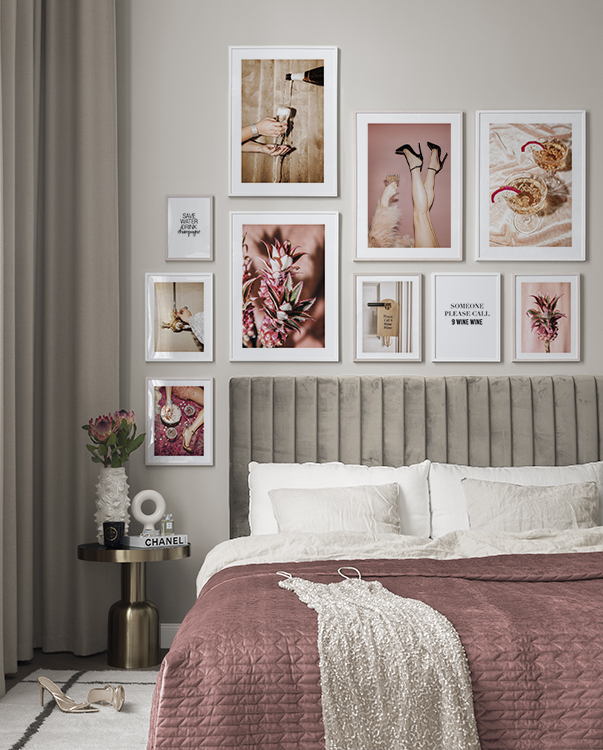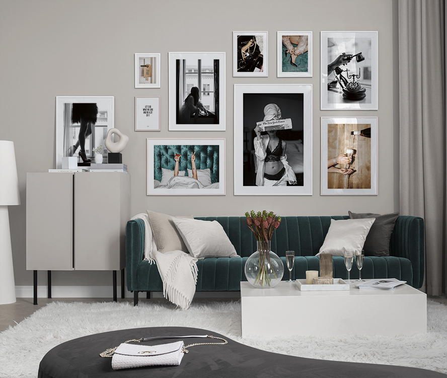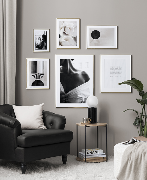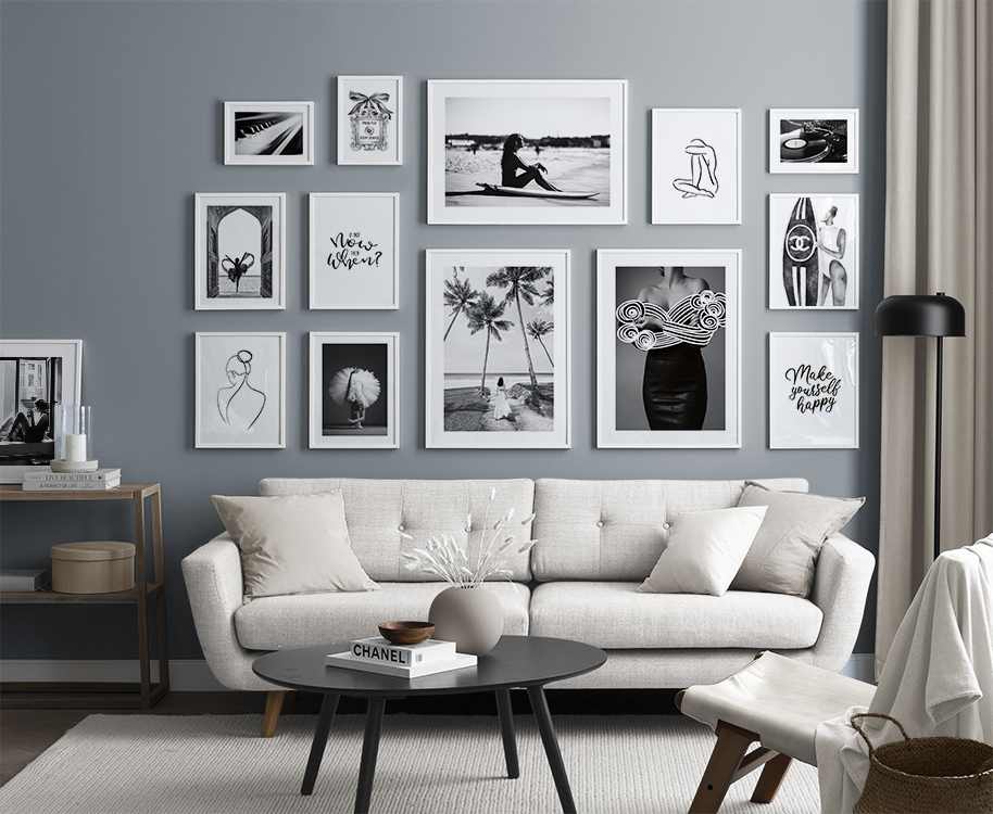 We continuously add new gallery walls according to season and the latest interior design trends. A new gallery wall allows you to easily and affordably change your interior decor to reflect what style you like. Our gallery walls are ready to buy, including both prints and frames. For example, you can buy a gallery wall for a kitchen with gorgeous drink prints or black and white photo art for a more modern interior style, or you can get a stylish gallery wall for a living room with minimalist illustrations!