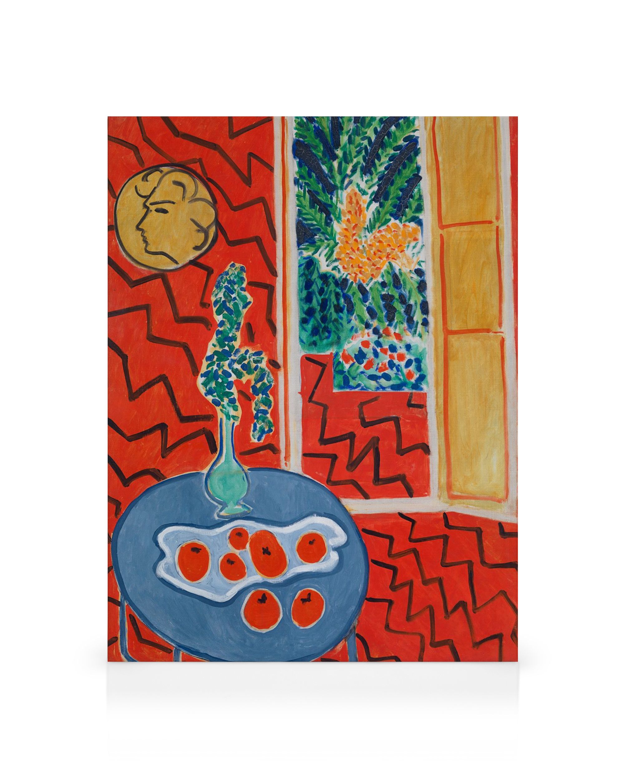 A canvas print showing a simple still life with red apples on a blue table. A plant and geometric shapes add colour to the red background.