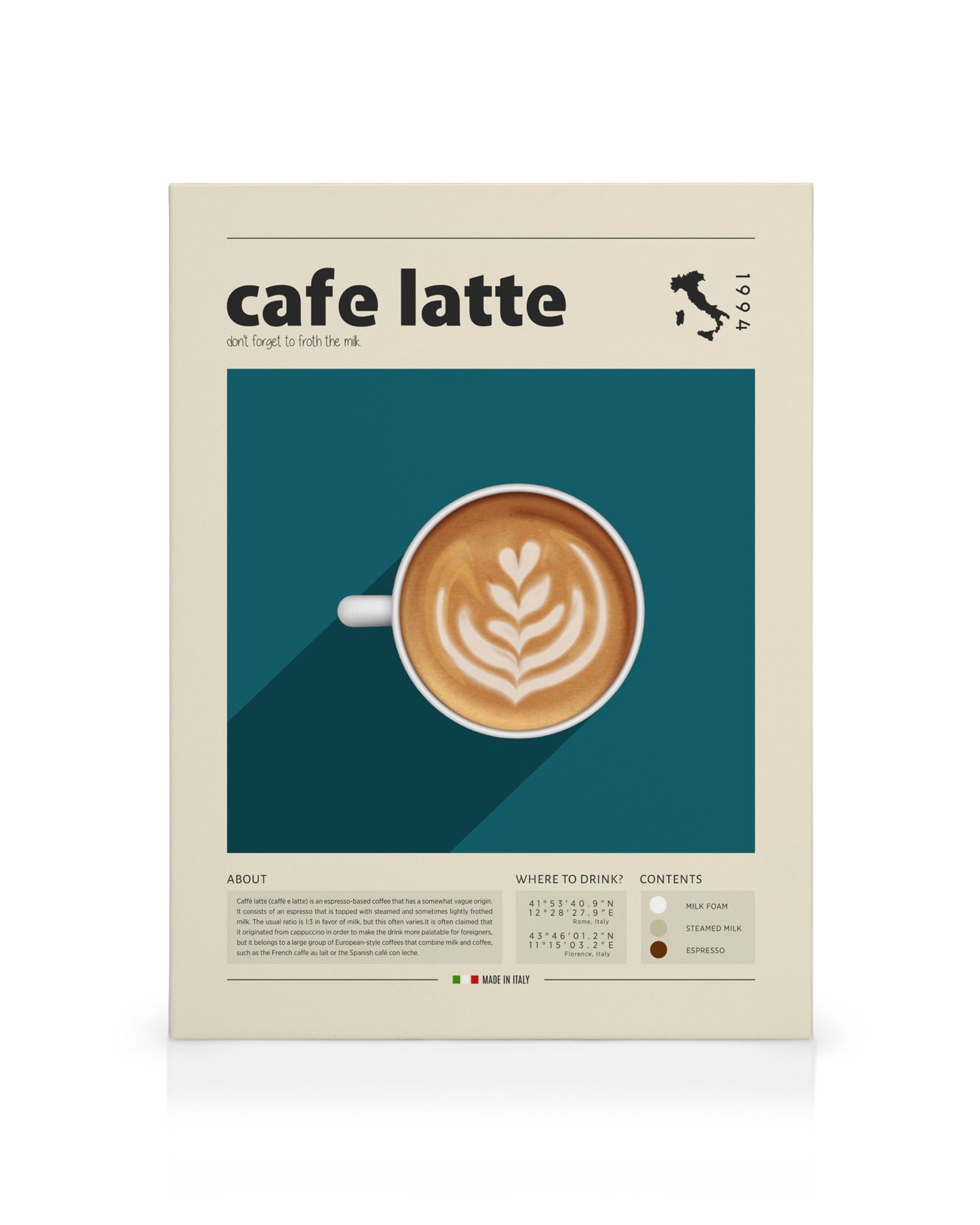 A coffee canvas print with latte art in a leaf pattern on a teal blue background. Perfect canvas wall art for your kitchen.