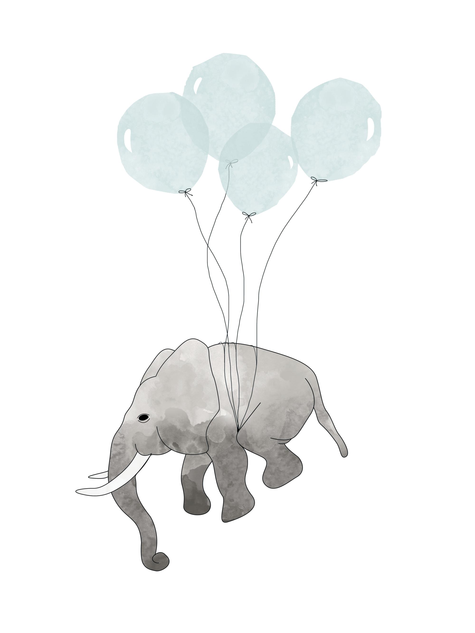 From €13Poster with a small elephant flying with blue balloons. A cute, imaginative illustration that fits perfectly in the children's room. We also have a similar children's poster with pink balloons.