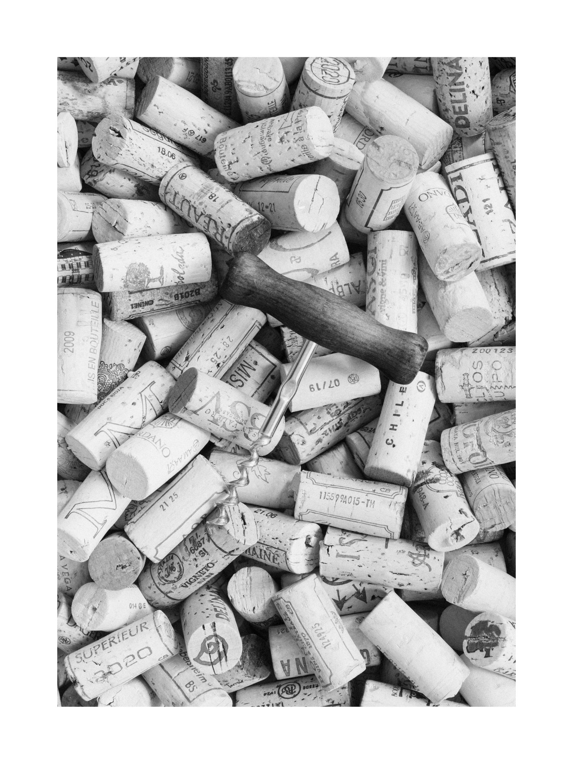 A black and white photographic poster capturing wine corks. An excellent pick for wine lovers and those who enjoy unique kitchen wall art. The intricate details of the corks provide a defined character and bring a touch of sophistication.