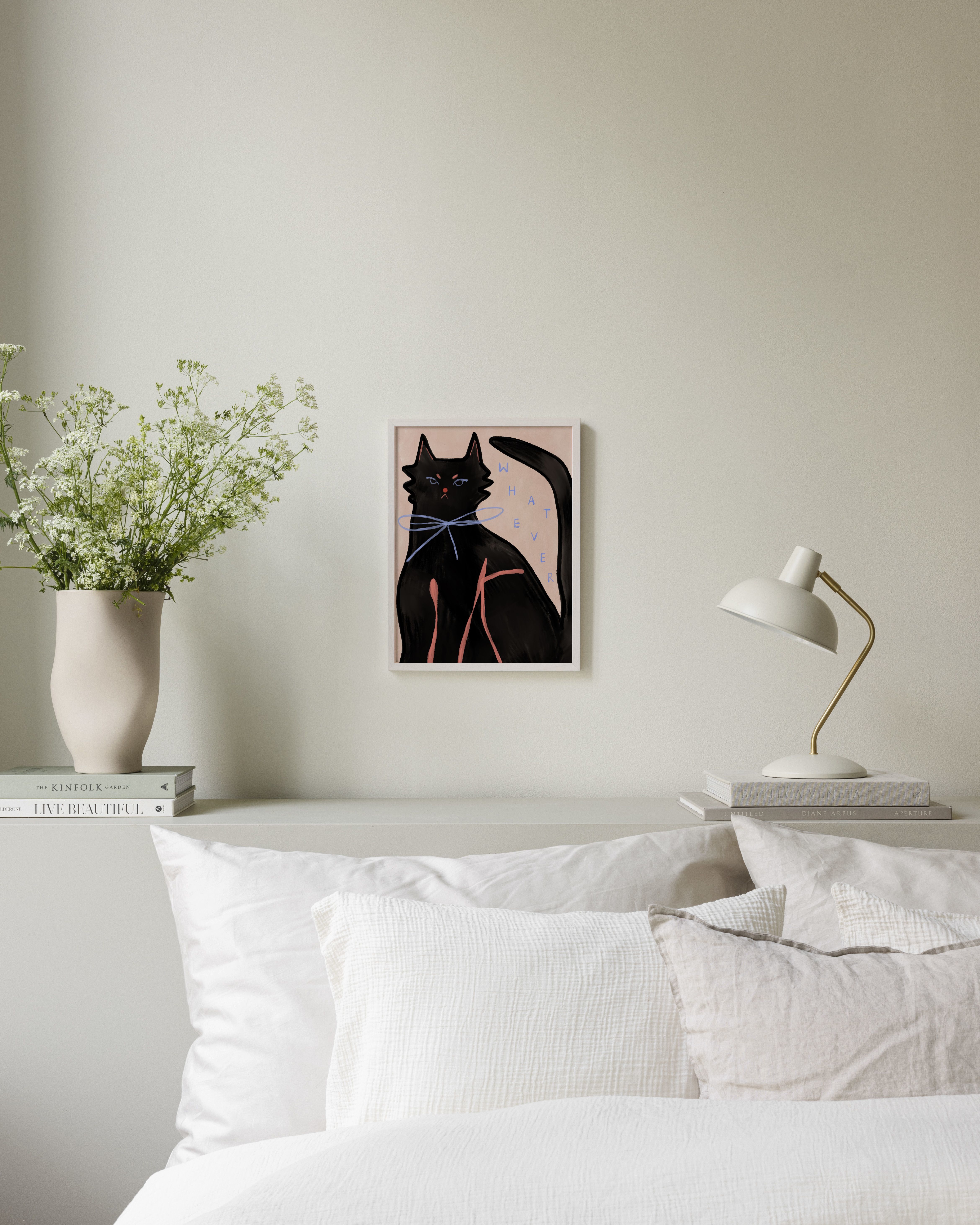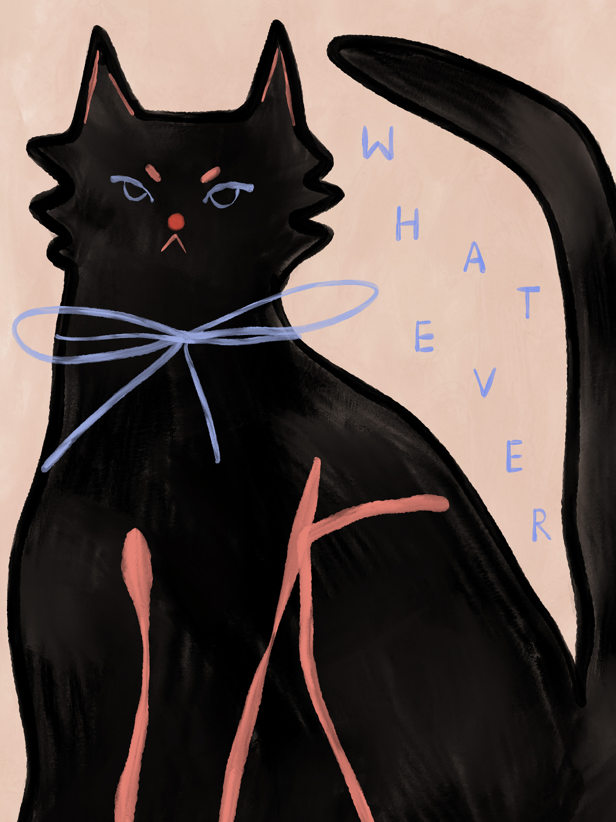 From €9.10A poster of a grumpy black cat with a light blue bow and the word "Whatever" in blue letters. The cat has pink and blue accents on its fur against a pale peach background.